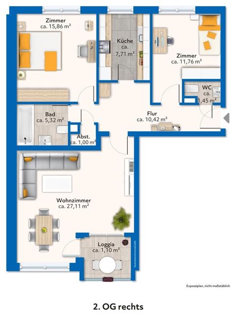 Man kommt über einen praktischen Flur in die Wohnung. Von dort aus kann man das Bad betreten. Es wird Ihnen eine Wanne, ein Waschbecken und ein WC geboten. Weiterhin gibt es hier einen kleinen Abstellraum. Der Mittelpunkt der Wohnung ist das großzügige Wohn-Esszimmer, mit Zugang zur Loggia. Hier kann man nach einem stressigen Tag entspannen. Gegenüber befindet sich die Küche, mit einer schönen Einbauküche. Es gibt unter anderem ein Cerankochfeld sowie einen Geschirrspüler. Die beiden anderen Zimmer sind ebenfalls sehr gut geschnitten. Für Gäste bietet die Wohnung noch ein Gäste-WC.