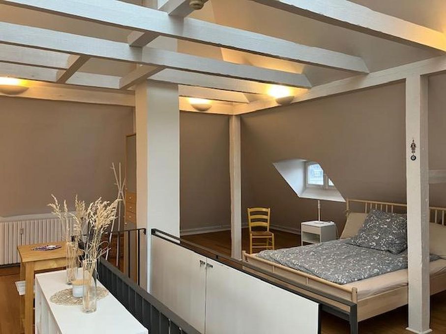Ein wunderschöner Raum mit großen Glasflächen und freigelegten Holzbalken bis unter den First. Das Dachstudio verfügt über ein Duschbad, eine Küche und einen zusätzlichen Zugang über das Treppenhaus und eröffnet so viele Nutzungsmöglichkeiten.