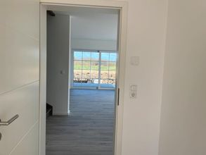 Im gesamten Haus ist Vinylboden verlegt. Die Holztreppe ist im gleichen Grauton geölt, sodass sie optisch wie aus einem Guss wirkt.